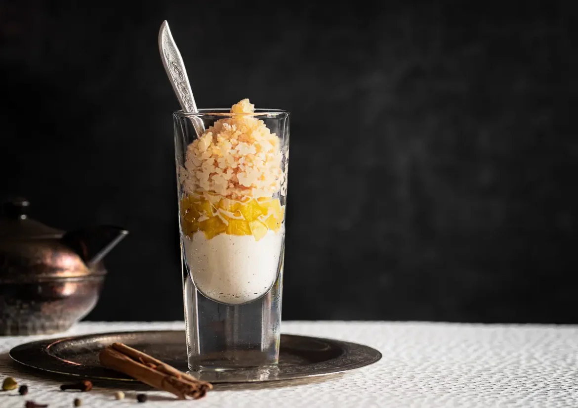 - To assemble the dessert, pipe mousse into a dessert glass, top with the cooled poached apples and just before serving, finish with a dome of chai granita.