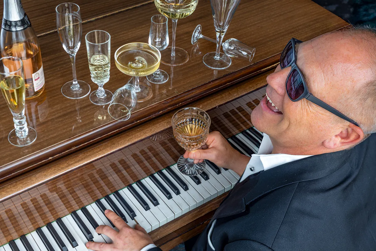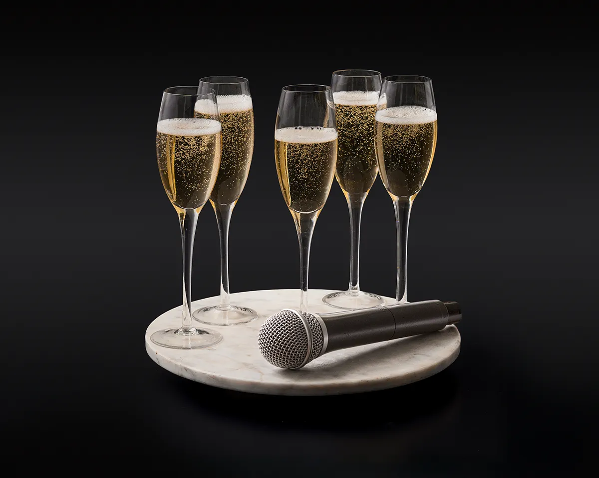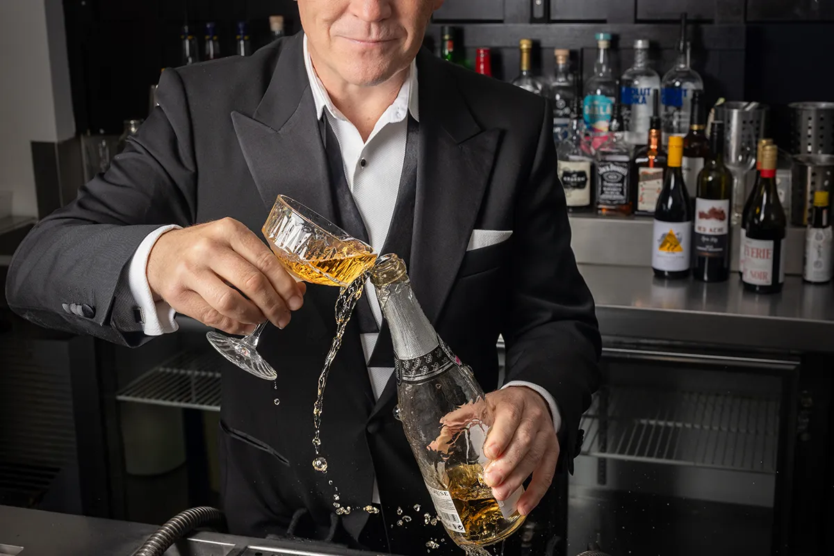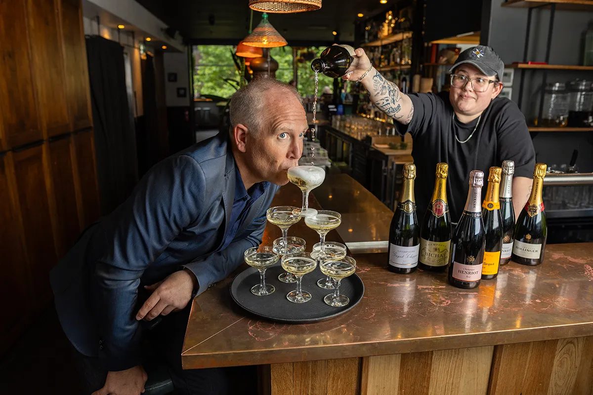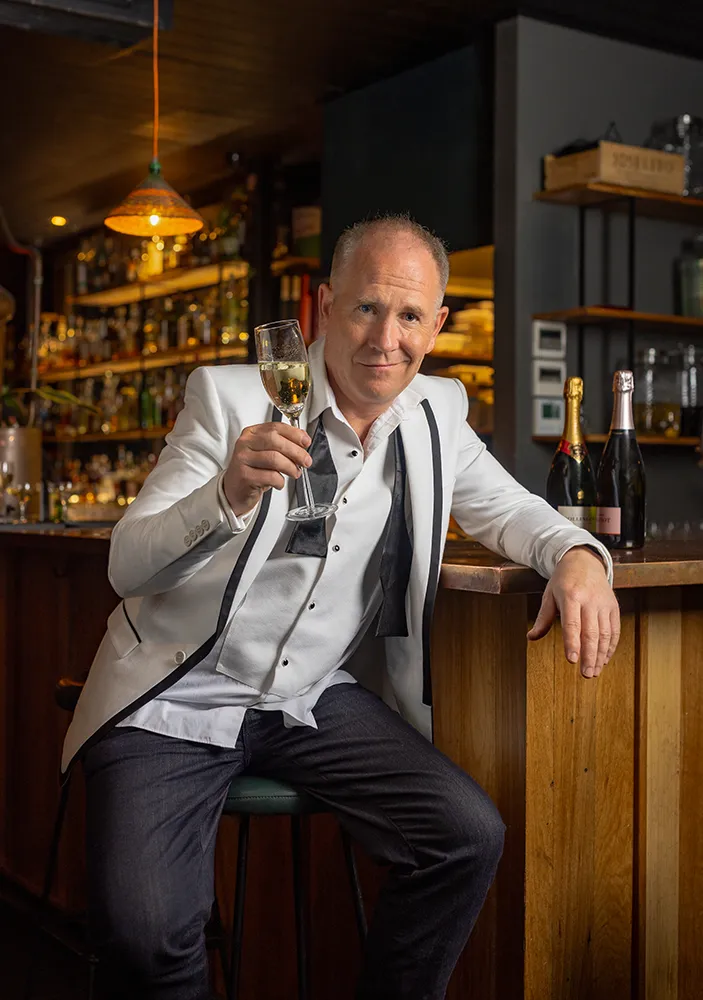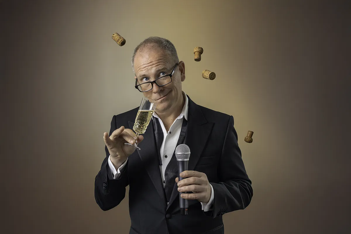 Promotional photos for Gene Blackley's champagne themed comedy show. Portrait and drink photography for print, web and socials.